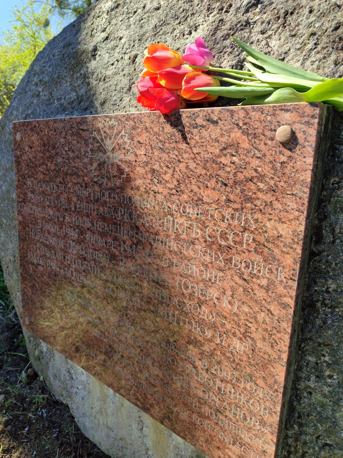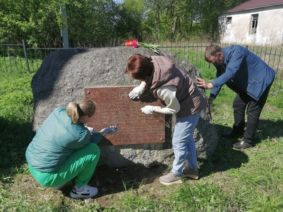 В рамках субботника были проведены в порядок прилегающая территория часовни Святого Георгия Победоносца и памятного знака разведгруппам Генштаба РККА и НКГБ СССР в поселке Заозерное Озерского района. Был собран мусор, очищена тротуарная дорожка и памятный знак. Памятный знак установлен в 2007 году в поселке Заозерном около часовни Святого Георгия Победоносца по инициативе КРОО "Союз работников правоохранительных органов" и ЗАО имени Суворова при поддержке Правительства Калининградской области. На территории установлен большой валун, на котором укреплена мемориальная доска с текстом: "В память бессмертного подвига советских разведгрупп Генштаба РККА и НКГБ СССР, совершённого в тылу немецко-фашистских войск в июле 1944-го - январе 1945-го годов в районе Норденбург (Крылово) - Даркемен (Озёрск) - Гольдап (Голдап): "Джек" - "Восход" - "Максим" - "Олень" - "Орион" - "Штык" и других". |